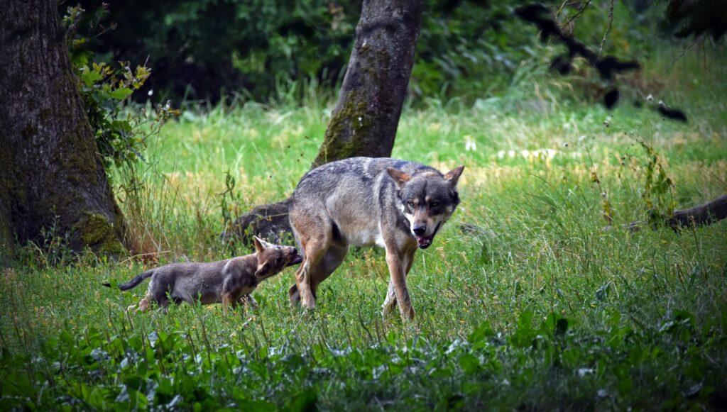 Als de welpen nog heel klein zijn, gaat de reu alleen op jacht. Hij is dan de enige kostwinner en brengt voedsel aan voor het teefje, dat permanent bij de welpen blijft. De taak van de leidende wolvin is om de nieuwe jongen te zogen, hen warm te houden en hen te beschermen tegen vossen, marters of wilde zwijnen. In principe transporteert de reu het voedsel in zijn maag, om bij het nest alles weer op te braken. Zo voorkomt hij dat hij de positie van het nest verraadt. Sporadisch worden stukken prooi toch gedragen in de muil.