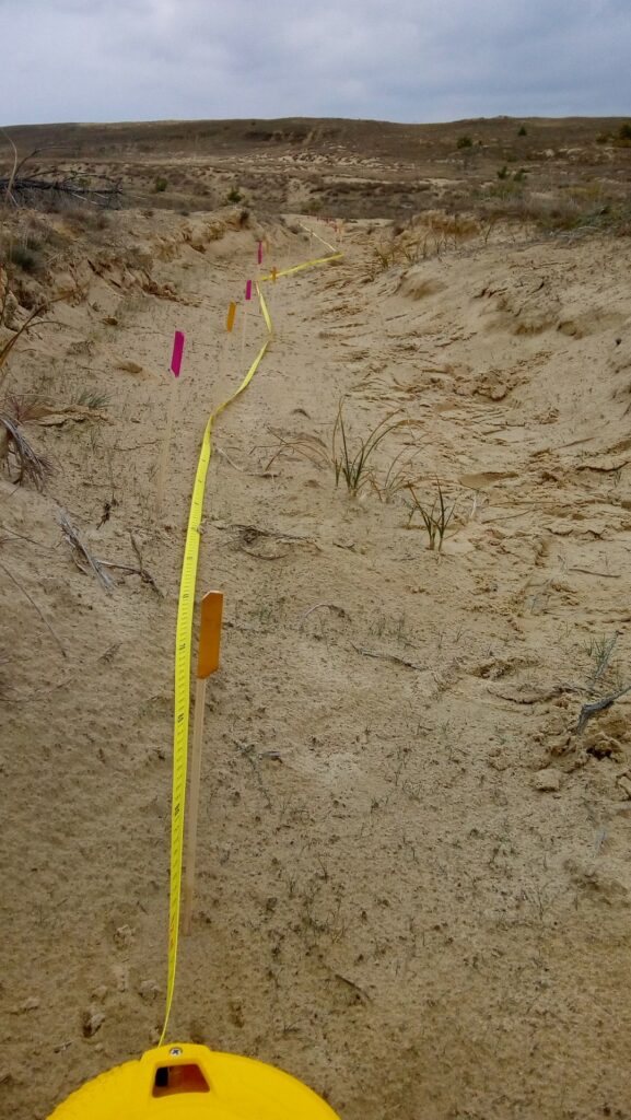 Als je genoeg gekleurde prikkers hebt meegenomen, kun je een wolvenspoor over een langere afstand visualiseren in het landschap en er duidelijke beelden van maken. Om de sporen van samenlopende wolven te markeren heb je nog meer prikkers en kleuren nodig, dat spreekt voor zich.