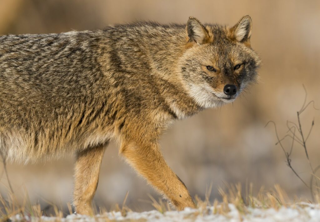 De naam goudjakhals is in feite ietwat verwarrend. De kleuraanduiding klopt wel: de vachtkleur is zandkleurig of rossig grijsgeel met een gouden glans tot goudrood; zijn Latijnse naam – Canis aureus – betekent dan ook ‘gouden hond’. Het is de kwalificatie ‘jakhals’ die je op het verkeerde been kan zetten: de goudjakhals is nauwer verwant aan de iets forsere Amerikaanse coyote en aan de wolf dan aan de zadeljakhals en de gestreepte jakhals die we kennen uit documentaires over de Afrikaanse savanne. In Noord-Afrika komt nog een andere hondachtige voor die als twee druppels water op de goudjakhals lijkt: de gouden wolf. Die is nauwer verwant aan de Europese wolf dan aan de goudjakhals.