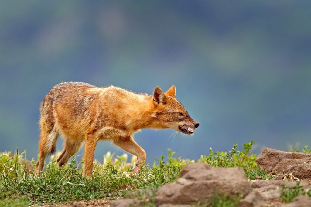 In gebieden waar ook wolven voorkomen, leven jakhalzen bij voorkeur net in die delen die de wolven mijden. De wolven zouden de jakhalzen immers doden als ze elkaar tegenkomen; binnen een wolventerritorium zouden de jakhalzen dus voortdurend gevaar lopen.